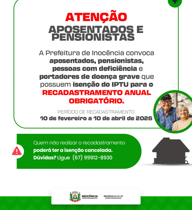A Prefeitura de Inocência informa que está aberto o período de recadastramento anual obrigatório para aposentados, pensionistas, pessoas com deficiência e portadores de doença grave que possuem isenção do IPTU no município.